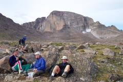 3 hikers on a large, smooth, rounded rock with green mountains in the background