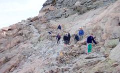 Jocelyn scrambling from the steep homestretch, with a valley in the background