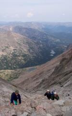 In the background is Long's Peak showing the upper part of the forbidding east face, known as "The Diamond" to climbers.