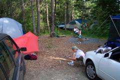 Here's a view of our camp site at Franstead Family Campground. Kathy's reading near the fire ring while Phil practices splitting wood. Our two tents, the screen canopy, and the 2 cars are also visible.