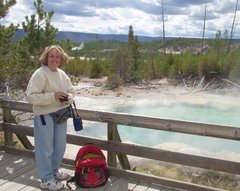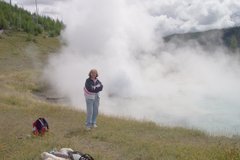 Kathy by the friendly Imperial Geyser. You didn't have to wait for a schedule; it would just erupt all the time. Every five minutes it would be quiet for a minute, then get back to its duty.