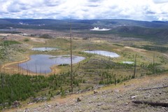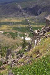 view of Imperial Geyser from the slopes of South Butte, Fairy Falls in the background